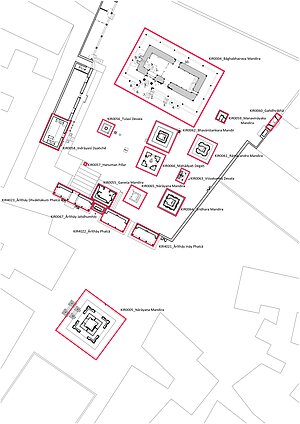 The statues dating back to the 3rd century at the complex are the oldest statues of Kirtipur (Bangdel 1982, p. 125-133). Besides these statues, there is a statue each of Umāmaheśvara and Śiva belonging to the 4th century (Bangdel 1982, 183-191). Referring to Gunde, the Gopālarājavaṃśāvalī (fol. 38b) mentions that Kīrtipāla Bhāro (text: Kitapāla Bhāro) was incarcerated in 1242 CE (NS 362) after Gundekvāṭha and Gochekvāṭha opened. This suggests that the Bāghabhairava complex had already been developed as a fort then.