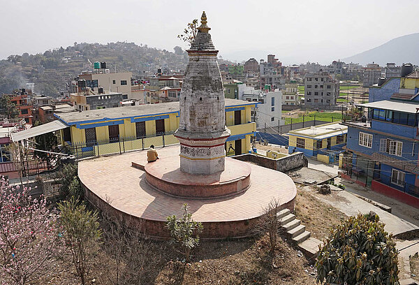 The Bhājaṅgala Lvahaṃ Degaḥ East (DANAM ID: KIR0084), situated between Kirtipur and Cobhāra hills atop Bhājaṅgala's highest point, holds vital historical and cultural significance. It's a distinctive shrine dedicated to patron deities from various Kirtipur clans. Built in 1684 CE by Rāmakṛṣṇa Bhāro and companions, the octagonal temple houses Bhairavī within an east-facing niche. Rooted in history, the temple is closely tied to Rājabhaṇḍārī and Bisyaḥ clans. Descendants of its founders, they gather annually to honour their patron deity. The temple's unique design, lacking an entrance and adorned with intricately carved toraṇas, adds to its architectural significance. Contrary to misconceptions tied to Kālu Pā̃ḍe's story in the battle of Kirtipur in 1760 CE, the temple's history predates his time. The Āśā Archives hold records confirming this context. Familial bonds endure through rituals, though anniversary ceremonies during Mārgaśīrṣa's bright fortnight have faded. Yet, the temple's legacy thrives through occasional whitewashing by locals. For further information, explore DANAM.
