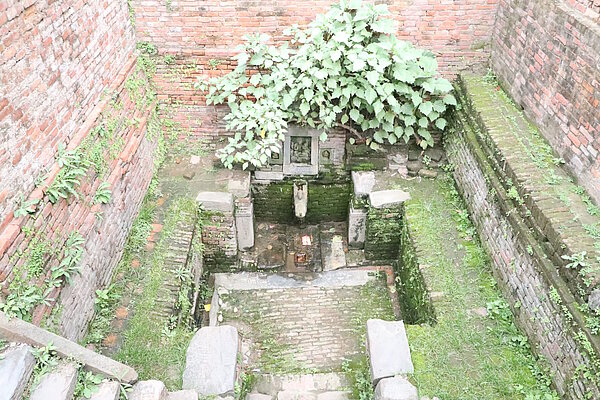 Located just outside the Byāsī Gate on Bhaktapur’s northern edge, the Byāsī Dhvākhā Pine Hiti (DANAM ID: BKT0730)(drinking fountain outside the gate) was built in 1643 CE (NS 763) by Jāminī Mayī of Tupulāchi. The gate itself was part of Bhaktapur’s old defensive system. The hiti has a west-facing single spout, once crowned by a now-lost hiti-pusā. Below the spout stands Bhagīratha, with Umāmaheśvara (Śiva and Pārvatī) above, flanked by Gaṇeśa to the north and Nṛtyeśvara to the south. A Viśveśvara liṅga lies southeast of the fountain, and a small jaḥdhuṇ (shrine niche) is set into the northern wall. An inscription from its founding notes that Jāminī Mayī commissioned both the water spout and the images of Umāmaheśvara and Viśveśvara Mahādeva, warning that anyone who defiles the site would face their divine wrath. Though historically and religiously important, the hiti has been dry for decades. It occasionally collects rainwater during the monsoon, but it remains unusable, with no restoration efforts by local authorities.