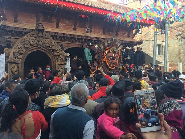 Newars have a tradition of visiting major shrines of the city after the establishment of a new statue. Following this tradition, after the installation of the Bhairava mask at the Phalcā, some 1000 devotees organised a religious visit of the nine major Bhairava shrines in the Kathmandu Valley: Pacalī Bhairava, Kāla Bhairava, Ākāśa Bhairava, Ānanda Bhairava, Vaṭuka Bhairava, Tyāṅgā Bhairava, Hayagrīva Bhairava, along with Kirtipur’s Bāgha Bhairava and Aṣṭasiddhi Bhairav.