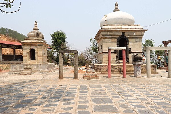 Situated atop a hillock in Tārukā, Nuwakot, the Hastikeśvara Mandira (DANAM ID: NWK0530) is a dome-style stone temple with a square sanctum. To the south of the temple lies a rest house (pāṭī), and to the north is the Kālikā shrine (NWK0530-012). The west-facing temple boasts an ornate stone toraṇa (archway) with Chepu, a mythical water creature, prominently displayed at its center. Inside the temple, a stone śivaliṅga, venerated as Hastikeśvara Mahādeva, serves as the main deity. The temple was constructed in 1829 CE by military commander Jāiphala Adhikārī, in honor of his mother, Hastikā, who had served as the wet nurse to King Gīrvāṇayuddha. As a token of gratitude, the king granted her 15 ropanīs of land in 1810 CE. Jāiphala, also known as Jāiphara, was responsible for the construction of several religious sites, including the Jāiphala Pāṭī in Nuwakot and the Jayarudreśvara Mandira in Kathmandu. The temple sustained severe damage during the 2015 earthquakes but was fully rebuilt by 2023 CE. Historically, Jāiphala had endowed land to support the temple's rituals, which were originally performed by Nepāla Brahmins but are now overseen by Rimāla Brahmins. Unfortunately, many of these rituals have declined due to unpaid tenant rents after the 2015 earthquakes, and traditional music at the temple has ceased. However, the Kālikā shrine still hosts a he-goat sacrifice during Dasaĩ and Caite Dasaĩ. For more details on this monument and others, please refer to the DANAM database.