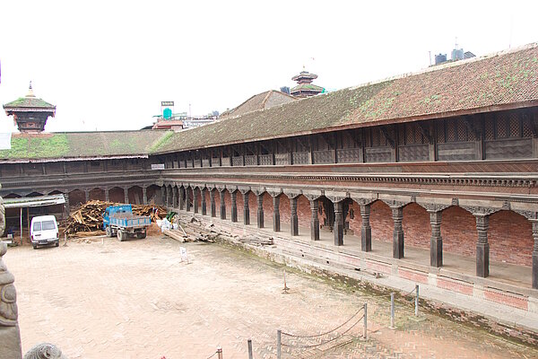 An inscription on the wall of the Phalcā dated 1683 CE, records its construction. King Jitāmitra Malla’s sons Ugra Malla and Bhupatindra Malla along with Minister Duḥkhi Bhāgirāma initiated the construction. Impressed by the construction of the Phalcā and the shrines in it, the king had enforced a new system regarding irrigation canals to facilitate the farmers of Bhaktapur. In a painting by Henry Ambrose Oldfield from 1854 CE a few bays and the wooden tower (pula) on the eastern section of this phalcā can be seen. A portion of the twenty-seven-bayed section of the phalcā collapsed in the 2015 earthquakes. It was reconstructed by the Department of Archaeology in 2020 CE.