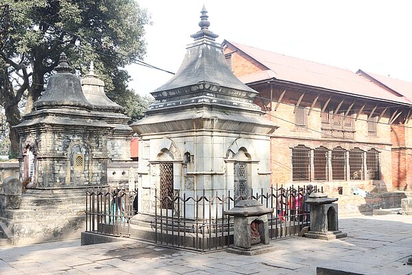 This Śiva temple (DANAM ID: PPK1936) stands as the earliest śivālaya from the Śāha period in the Paśupati region, commissioned by Rāmakṛṣṇa Kũvara, great-grandfather of Jaṅga Bahādura Rāṇā. Adorned with a bell-shaped roof and ceramic tiles, it features a stone śivaliṅga representing Rāmakṛṣṇeśvara Mahādeva. Nandī, Gaṇeśa, and Kālī statues accompany the main deity. Though lacking inscriptions about its construction, an inscription dated ŚS 1678 (1756 CE) on the Kālī statue suggests earlier origins. Rāmakṛṣṇa Kũvara's contributions during the Gorkha victory led to land grants and the construction of temples, including Rāmakṛṣṇeśvara. Conflicting accounts mention construction years like 1774 CE, 1769 CE, and 1874 CE. Rāmakṛṣṇa Kũvara passed away in 1787 CE, contributing to the establishment of a trust in 1781 CE for temple worship and maintenance. Renovated by Prime Minister Raṇa Uddīpa Siṃha, the temple now houses a stone śivaliṅga. Though daily rituals have ceased, descendants visit on Bālā Caturdaśī for special worship. The temple's historical significance underscores the need for active preservation and study. For more information about this monument, visit DANAM entry here.