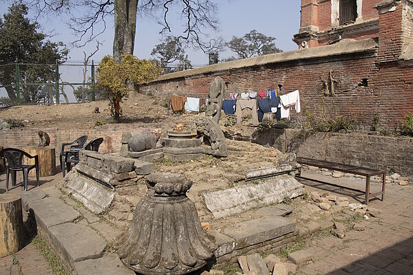 Raṇamukteśvara, a Śiva temple (DANAM ID: PPK1905), is believed to have been constructed in the early 1850s to honor Raṇamehara Siṃha Adhikārī by his son. Situated in the southwestern corner of the Mṛgasthalī complex, this śivālaya (lit. Śiva's abode) now lies in ruins. Located just a few meters west of the main path leading to the Gorakhanātha temple, Raṇamukteśvara Mahādeva, the primary deity represented by a śivaliṅga, remains exposed alongside other temple artifacts such as a stone archway (toraṇa) depicting Chepu, a mythical water creature, albeit without its columns and Nandī, Śiva’s animal mount. Originally, it was a śivālaya similar to most other structures here, constructed on two plinth levels with a bell-shaped roof, possibly crowned with a stone finial that can still be seen in what used to be the sanctum. The temple collapsed in the early 2000s and has since been neglected. For more detailed information, please visit our database.