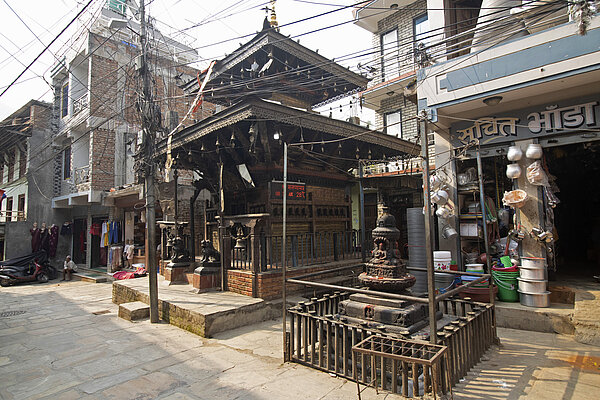 The Rāto Matsyendranātha Temple (DANAM ID: NWK0600), known locally as "Karuṇāmaya Degaḥ" and built by Lakṣmīnārāyaṇa Bhāro in 1821 CE, stands in Triśūlībajāra, Nuwakot, a region historically connected to the Kathmandu Valley. This north-facing temple features a two-tiered copper-sheeted roof with a gilded finial and intricate erotic carvings on its northern struts. Inside the sanctum, a red-faced, gilt-copper statue of Lokeśvara, gifted by the residents of Guji Bāhāḥ in Patan, serves as the main deity. The presence of this temple in Nuwakot testifies that the cult of Buṅgadyaḥ/Karuṇāmaya (Rāto Matsyendranātha) extends beyond the valley, reaching into the historic region of Nuwakot. Dive deeper into the fascinating history and details of this temple by visiting our comprehensive database.