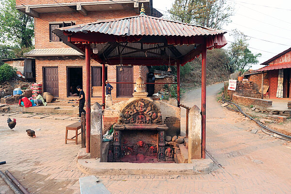 Located between the Taleju temple and Sātatale Durbar in Nuwakot, the Rudrāyaṇī Pīṭha (DANAM ID: NWK0230) is an underground shrine that houses three arched stone slabs, revered as deities. The central slab, slightly larger and featuring a carved depression, serves as the primary deity. An aniconic stone is positioned in front of it. The two adjoining slabs are adorned with rare floral patterns. Above the sanctum stands a large stone toraṇa (archway), supported by two intricately carved stone pillars. The toraṇa prominently displays a Chepu, a mythical creature, along with a six-armed Bhairava at the center, flanked by Gaṇeśa and Kumāra. Such toraṇas are uncommon even in the Kathmandu Valley, prompting speculation about whether the shrine is dedicated to Bhairava rather than Rudrāyaṇī. While an eroded inscription fails to provide clarity, Bhairava’s ritual symbols—a jagged knife and skull cup—are seen atop the shrine. The origins of the shrine are uncertain, though the stone carvings suggest it dates back to the late medieval period. A 1933 CE inscription mentions a bell donation by Ratnamānasiṃha of Sahara Ṭola, Nuwakot. As of April 2024, there is no recorded association with a gūṭhī (trust) or donor family. However, offerings are made at the shrine during Nuwakot’s festivals, including bhujā during Dasaĩ and a state-sanctioned duck sacrifice on the 9th day of the festival. For further details on this monument and others, please refer to the DANAM database.
