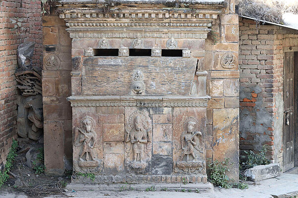 The Jaḥdhuṃ Water Tank (DANAM ID: CHG0051), built in 1657 CE (NS 777) by Kāśī Bhāro, Gaṃgārāma Bhāro, and Śiva Bhāro, is located on the road from Cāpāgāũ to Bulu in Pāulī Ṭola. Once serving pilgrims, travelers, and farmers, the tank features three stone ceremonial mirrors (jvalānhāykaṃ) and a statue of Bhagīratha. Despite its historical significance, it is now in disrepair and unused. The inscription mentions the brothers' contribution but lacks any reference to a maintenance trust. Although it was repaired during the 1980s, the tank is currently neglected, with no religious or cultural activities linked to it. The water architecture of the Kathmandu Valley, which dates back to the Licchavi period, can still be observed in areas like this one. For more details on this monument and others, please refer to the DANAM database.