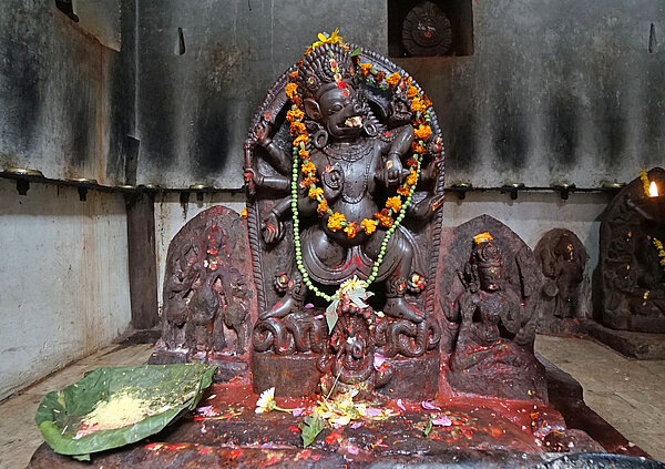 Located within the Hanumandhoka Durbar Square, the Varāha temple (DANAM ID: KAT1522) has remained relatively unexplored by scholars and the public. Its discreet position in the palace's western area has kept it hidden from casual view. Inside, a finely crafted Varāha statue, often mistaken for Nīlavārāhī, resides, showcasing 17th-century artistry. Restored after the 2015 CE earthquake, this monument's documentation is a focus of the Nepal Heritage Documentation Project. This effort aims to preserve and share its significance with scholars and the public alike. For more details, visit For further information, explore DANAM.