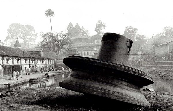 Located within the sacred confines of the Rājarājeśvarī cremation ground near the Bagmati River, an extraordinary śivaliṅga, revered as Viraṭeśvara Mahādeva (DANAM ID: PPK0730), graces the landscape. Locally referred to as Ḍhalkeśvara Mahādeva owing to its northern inclination (Nep. ḍhakalnu, meaning, "to tilt"), this imposing liṅga bears profound historical significance as the largest of its kind in the Paśupatikṣetra, emanating the spiritual essence of the region. Although its precise origin remains concealed within the sands of time, the Himvatkhaṇḍa, a prominent Himalayan text, hints at the presence of a subterranean water reservoir beneath Virāṭeśvara. This mystical aquifer was believed to offer glimpses into the future, a divine bestowment by Lord Brahmā to facilitate spiritual enlightenment. Legends recount the existence of a concealed water chamber beneath the śivaliṅga, where the discernment of King Śaṅkaradeva led to its consecration, veiling its prophetic insights. Another narrative suggests that the decision to obscure the water chamber, which unveiled forthcoming births, prompted the placement of the śivaliṅga. Chronicles disclose that this revered śivaliṅga, also recognized as Āpāṃsajātismaraṇa, emerged to avert potential disruptions arising from the prediction of future occurrences. Virāṭeśvara Mahādeva stands as a modest sentinel of temporal progression, as no significant socio-cultural activities are associated with this liṅga. For further information, explore DANAM.