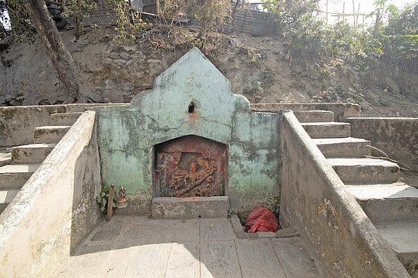 Viṣṇuvikrānta is a form of Viṣṇu depicted taking three strides, symbolizing the encompassing of the three worlds. Established by King Mānadeva in the 5th century, the statue of Viṣṇuvikrānta (DANAM ID: PPK0430) currently remains neglected in the open. Once part of a grand temple, the statue has now (as of February 2024) been placed inside a concrete west-facing niche just below a narrow path around the makeshift huts built west of the southeastern entrance to the Paśupati area. On the same day, King Mānadeva established two similar statues in two different locations, both in the name of his mother, who is not otherwise featured in any other installations after these two. This suggests that he erected these statues after the death of his mothe. Although the inscription on the statue mentions the construction of a grand temple, no such temple remains in the vicinity. For more detailed information, please visit our database.